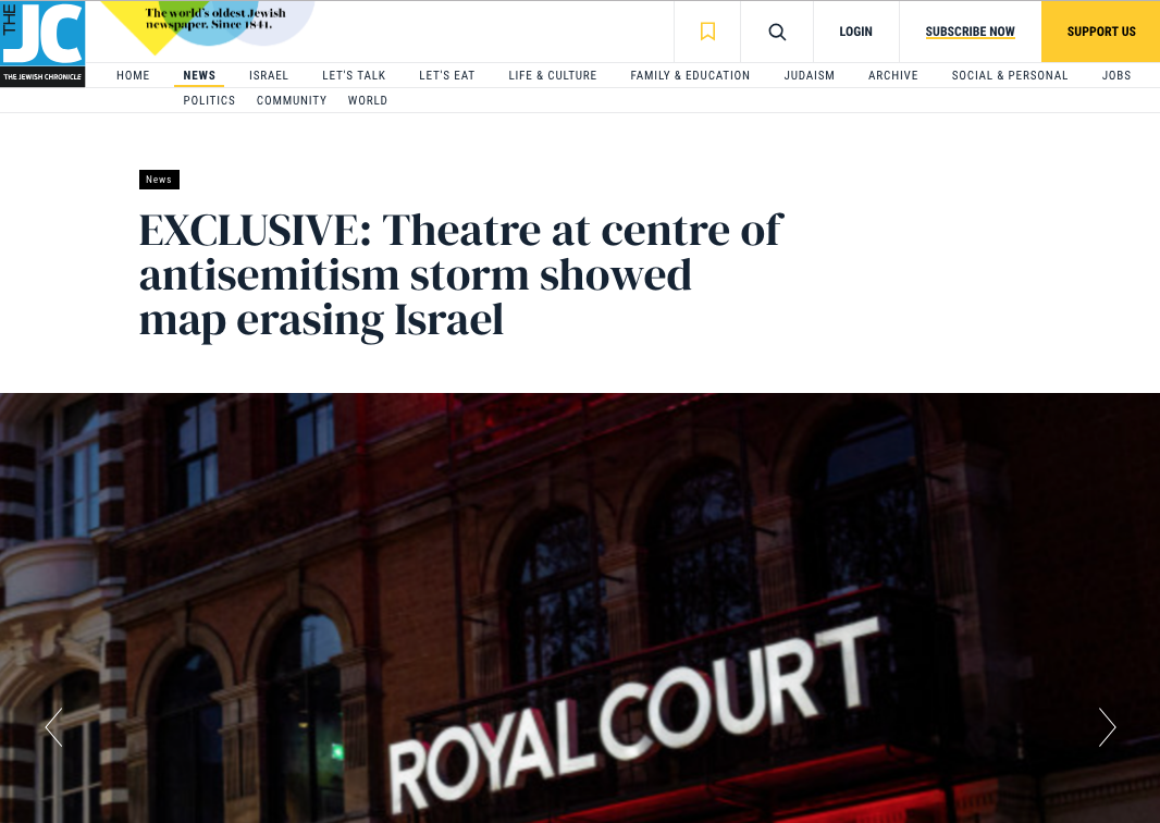 Alex Hearn, Director of Labour Against Antisemitism, said: “The Royal Court Theatre has previously courted controversy for plays and characters which have attracted accusations of anti-Semitism. Now it appears it has been attempting to erase any record of Israel at all.