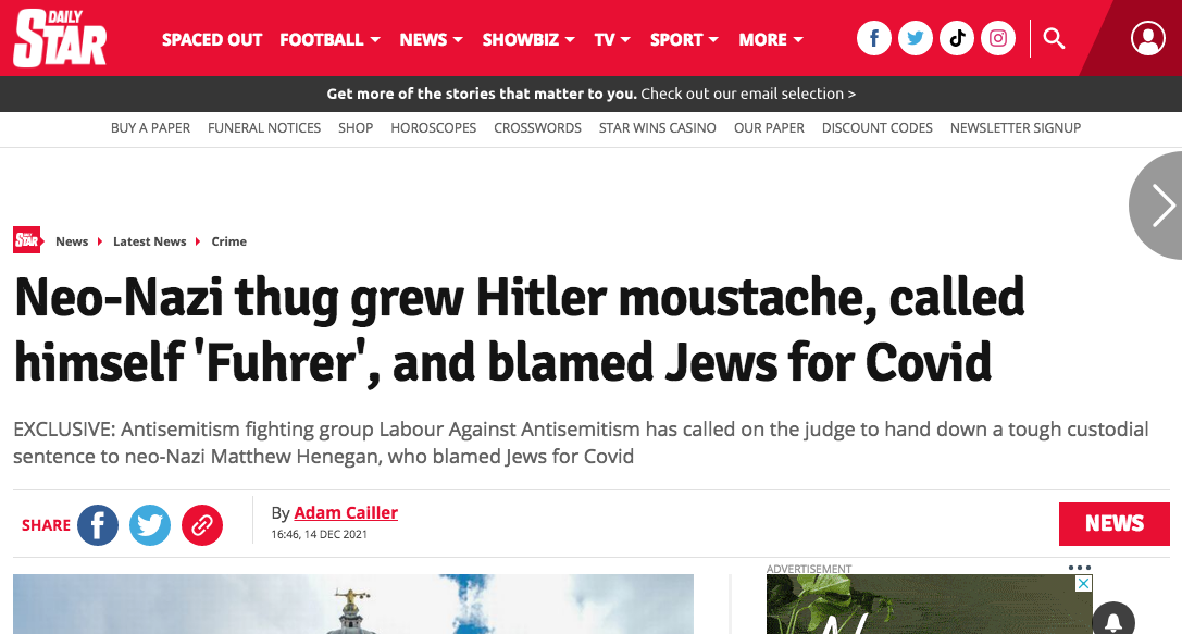 EXCLUSIVE: Antisemitism fighting group Labour Against Antisemitism has called on the judge to hand down a tough custodial sentence to neo-Nazi Matthew Henegan, who blamed Jews for Covid