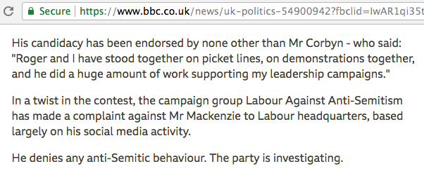 “In a twist to the contest, the campaign group Labour Against Antisemitism has made a complaint against Mr Mackenzie to Labour headquarters, based largely on his social media activity”