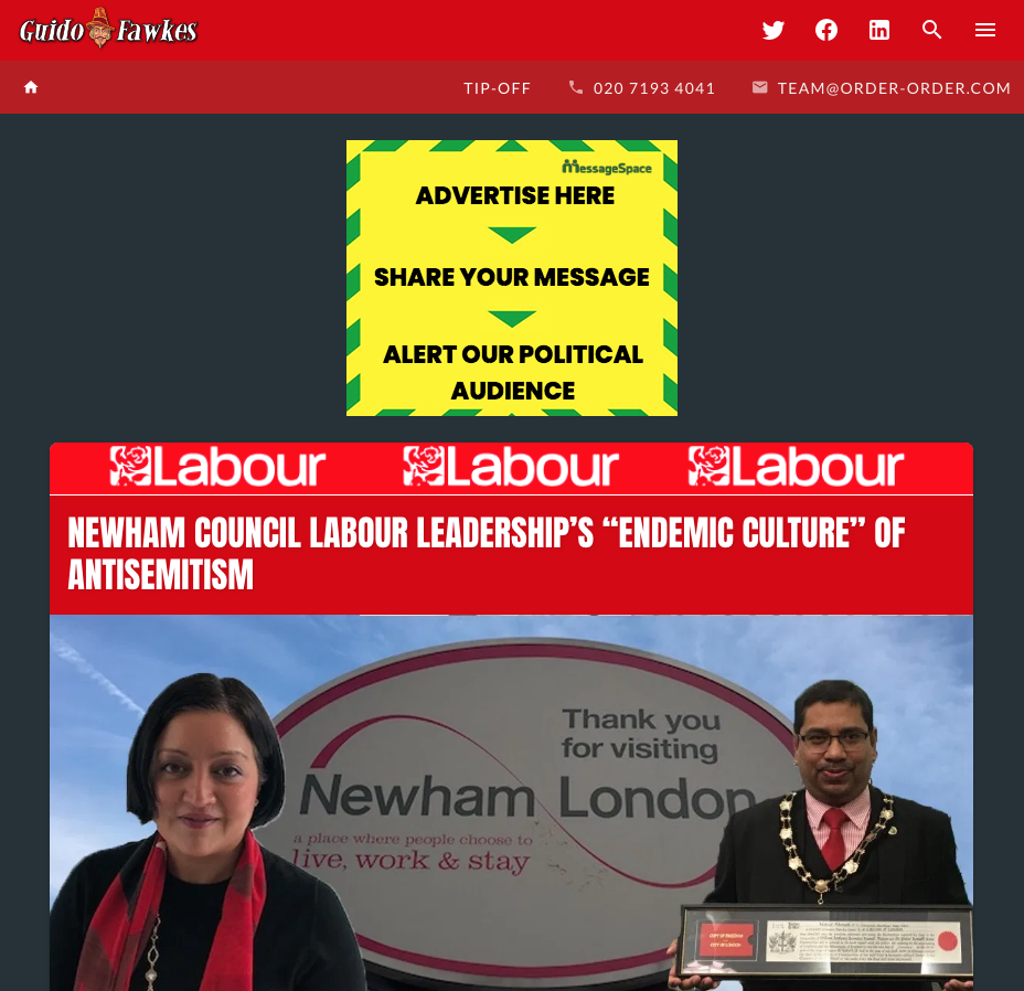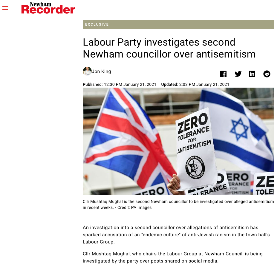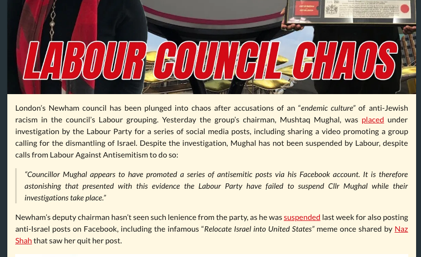 “We are uncertain why they are failing to do that in this instance. We urge an immediate suspension and a full investigation into what appears to be an endemic culture of anti-Jewish racism among the Labour Group on Newham Council,” he said.