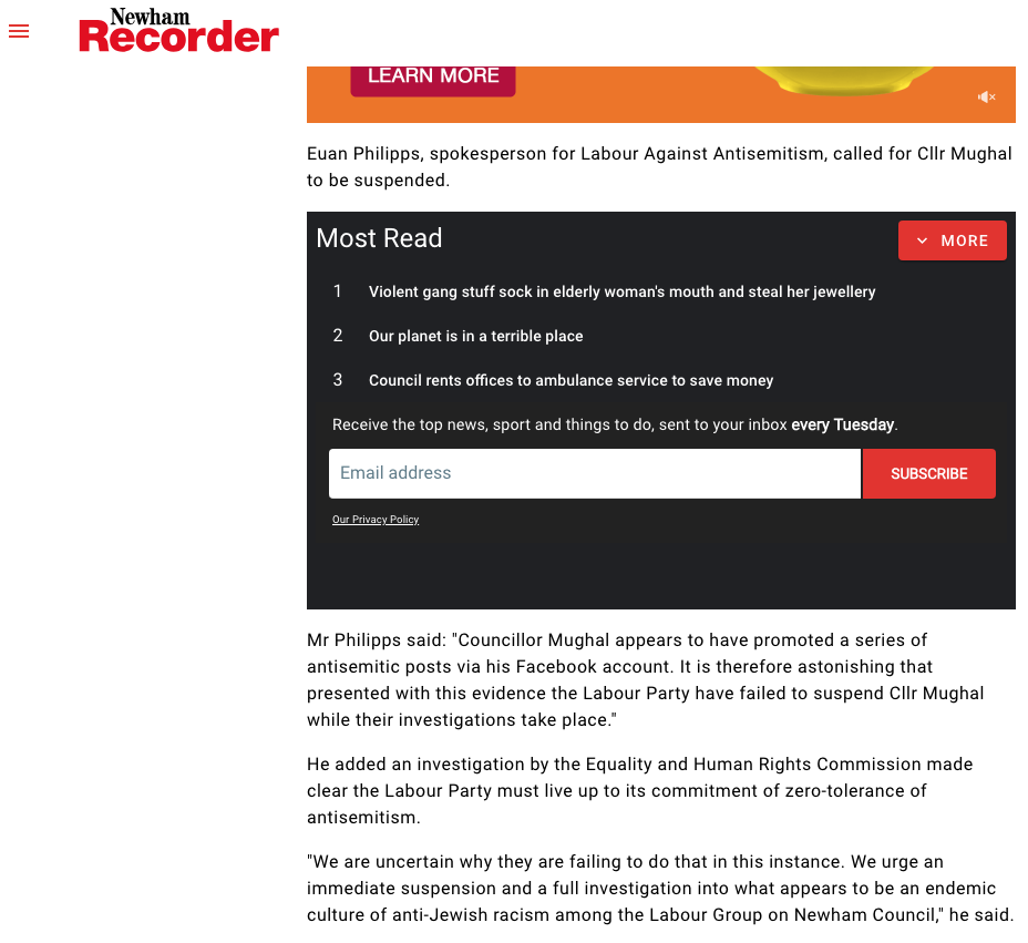 Euan Philipps, spokesperson for Labour Against Antisemitism, called for Cllr Mughal to be suspended.